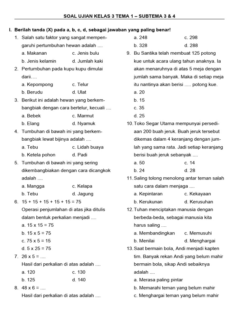 Kurikulum kelas 3 SD mencakup berbagai mata pelajaran fundamental. Soal-soal ujian umumnya dirancang untuk menguji pemahaman siswa pada setiap mata pelajaran tersebut. Berikut adalah beberapa mata pelajaran utama dan jenis soal yang sering muncul: